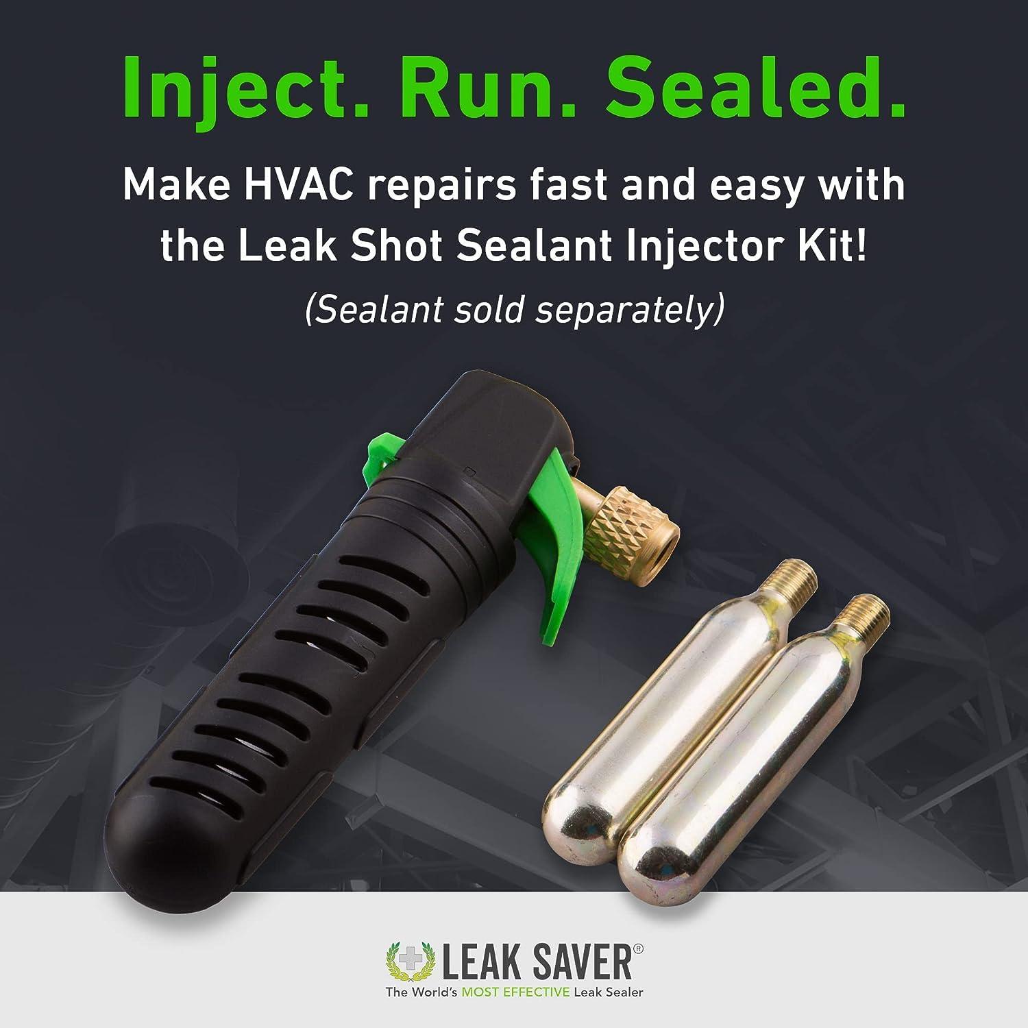 The kit includes one Leak Shot Injection Gun and two refrigerant-grade CO2 cartridges (multiple uses per cartridge).