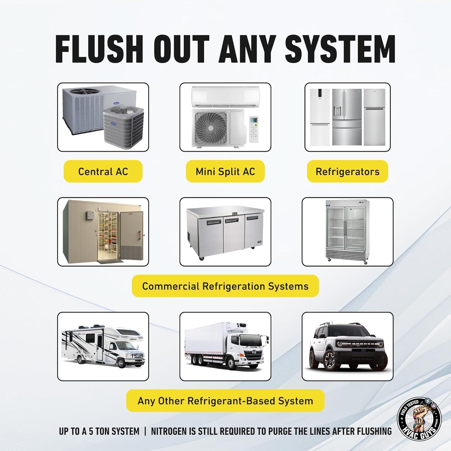 AC FLUSH KIT AND SOLVENT: The pressurized 140 PSI formula allows you to easily flush out line sets of central air conditioners, ductless mini splits, packaged units, refrigerators, commercial refrigeration systems, and any other refrigerant-based system. Please note that nitrogen is still required to purge the lines after flushing. Please refer to the instruction sheet for proper use. Refer to the sizing table for appropriate system sizing.