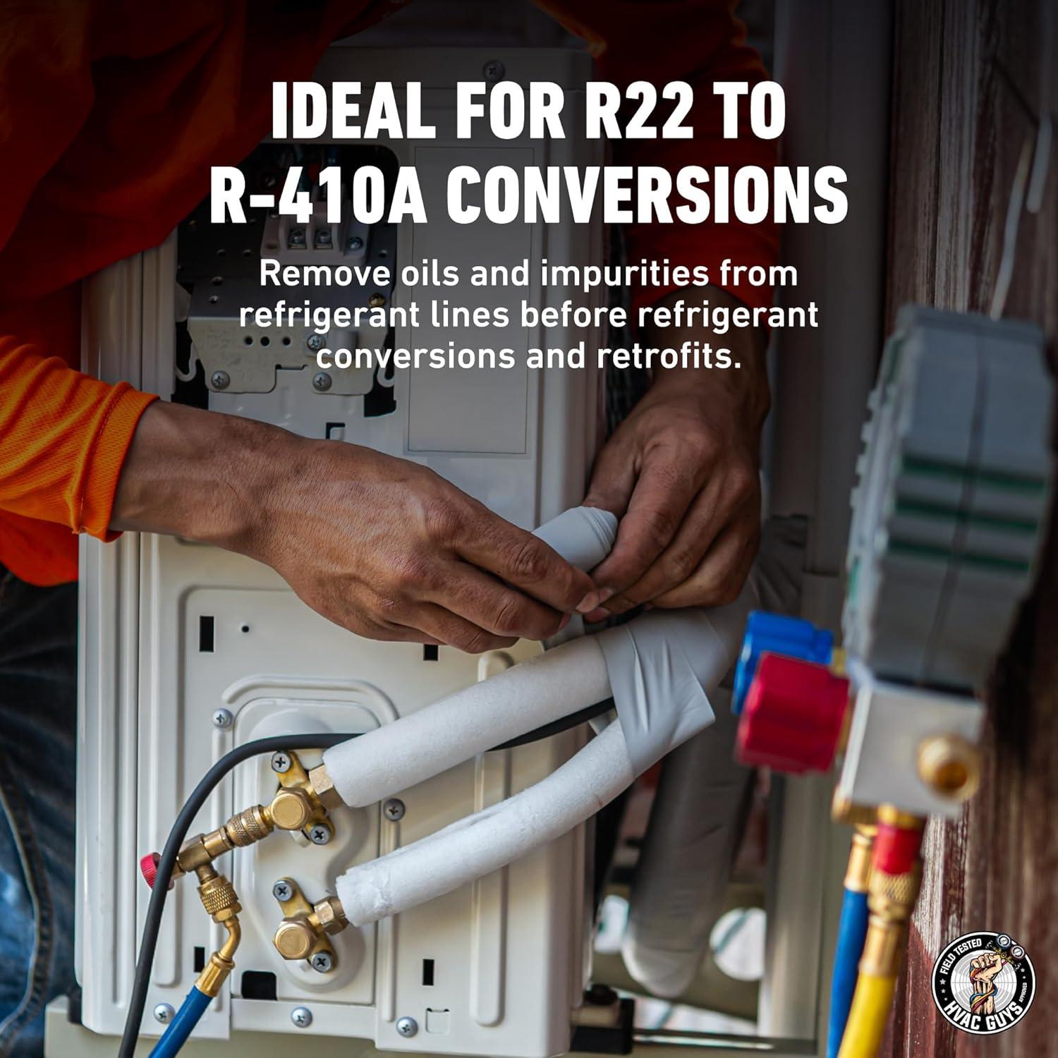 PERFECT FOR R22 to R-410 CONVERSIONS: Our HVAC flush solvent is great for removing oil and other impurities from inside refrigerant line sets while performing R22 to 410A refrigerant conversions and retrofits. It is suitable for removing system oils and cleaning out the line sets for all other types of HVACR refrigerant conversions as well.