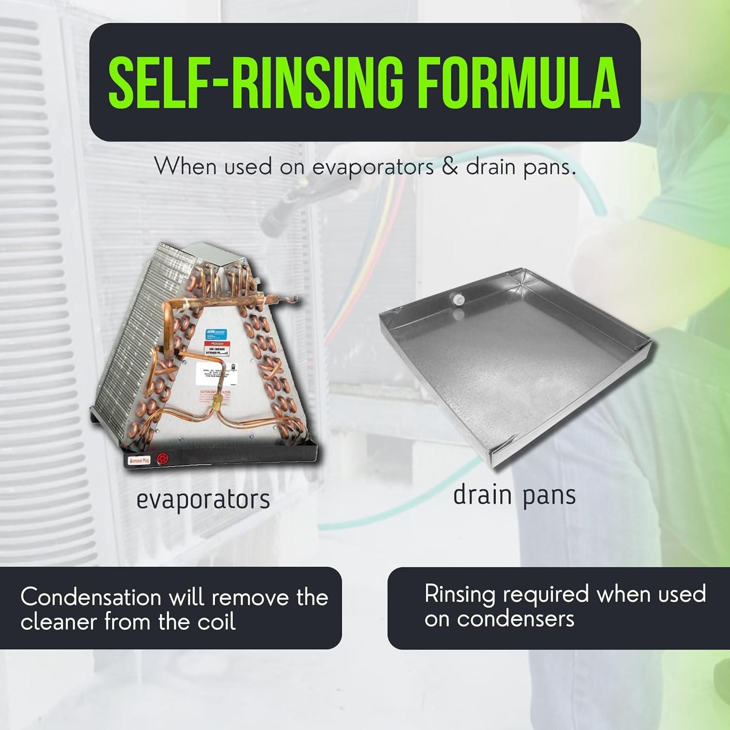 FOR EVAPORATORS (NO-RINSE) AND CONDENSERS: The Foam Blaster is made for both evaporators (no rinsing required) and condensers (light rinsing with water required). When using on evaporators, the condensate water from the unit in operation will rinse off the dirt, debris, and product.